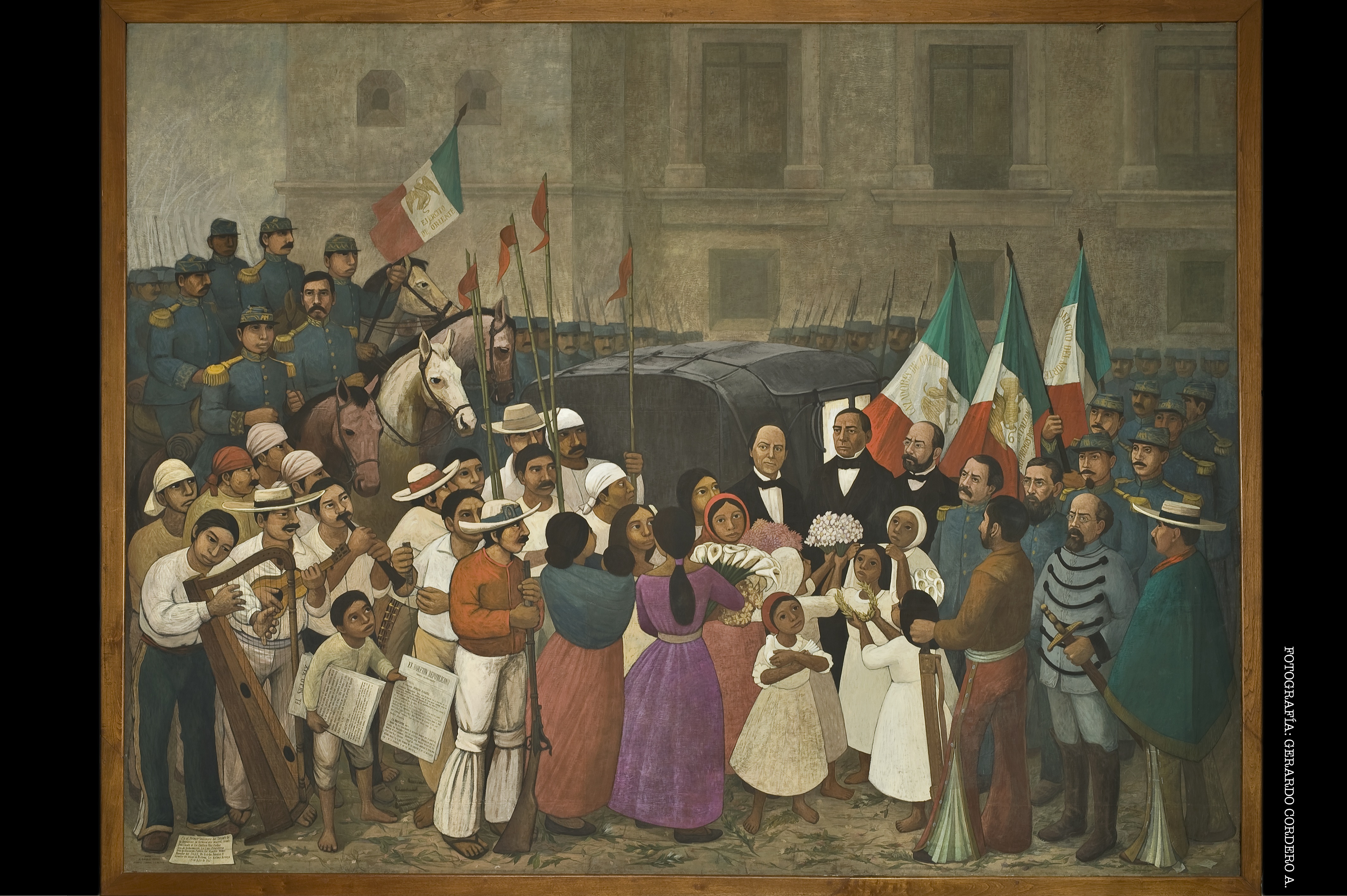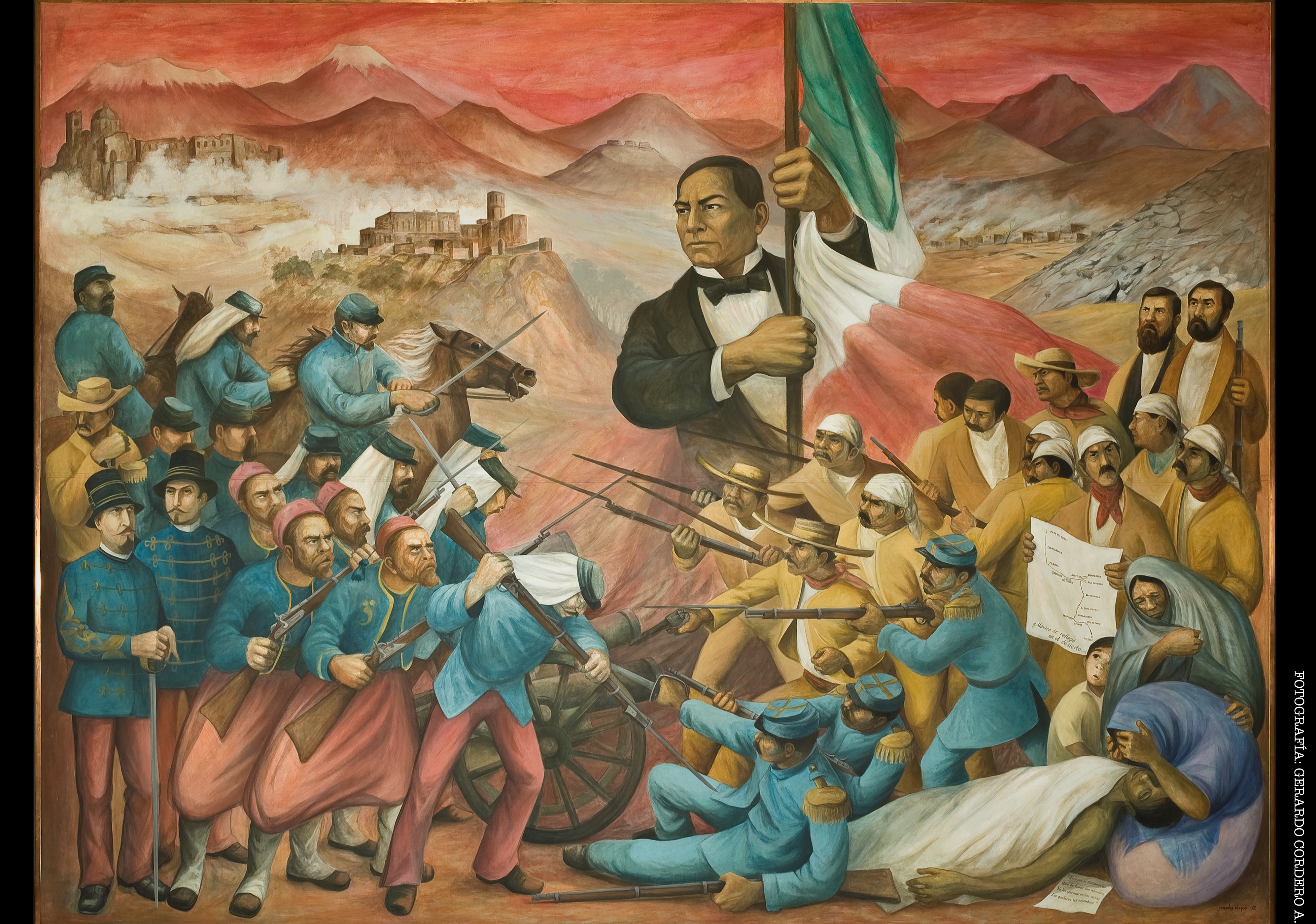 Esta obra forma parte de la conmemoración del centenario del fallecimiento de Benito Juárez. Muestra un pasaje del enfrentamiento entre el ejército invasor y los combatientes mexicanos que defendían el territorio en los años 1862-1867. Sobresale la figura de Juárez con la bandera, que simboliza la fuerza del poder republicano.